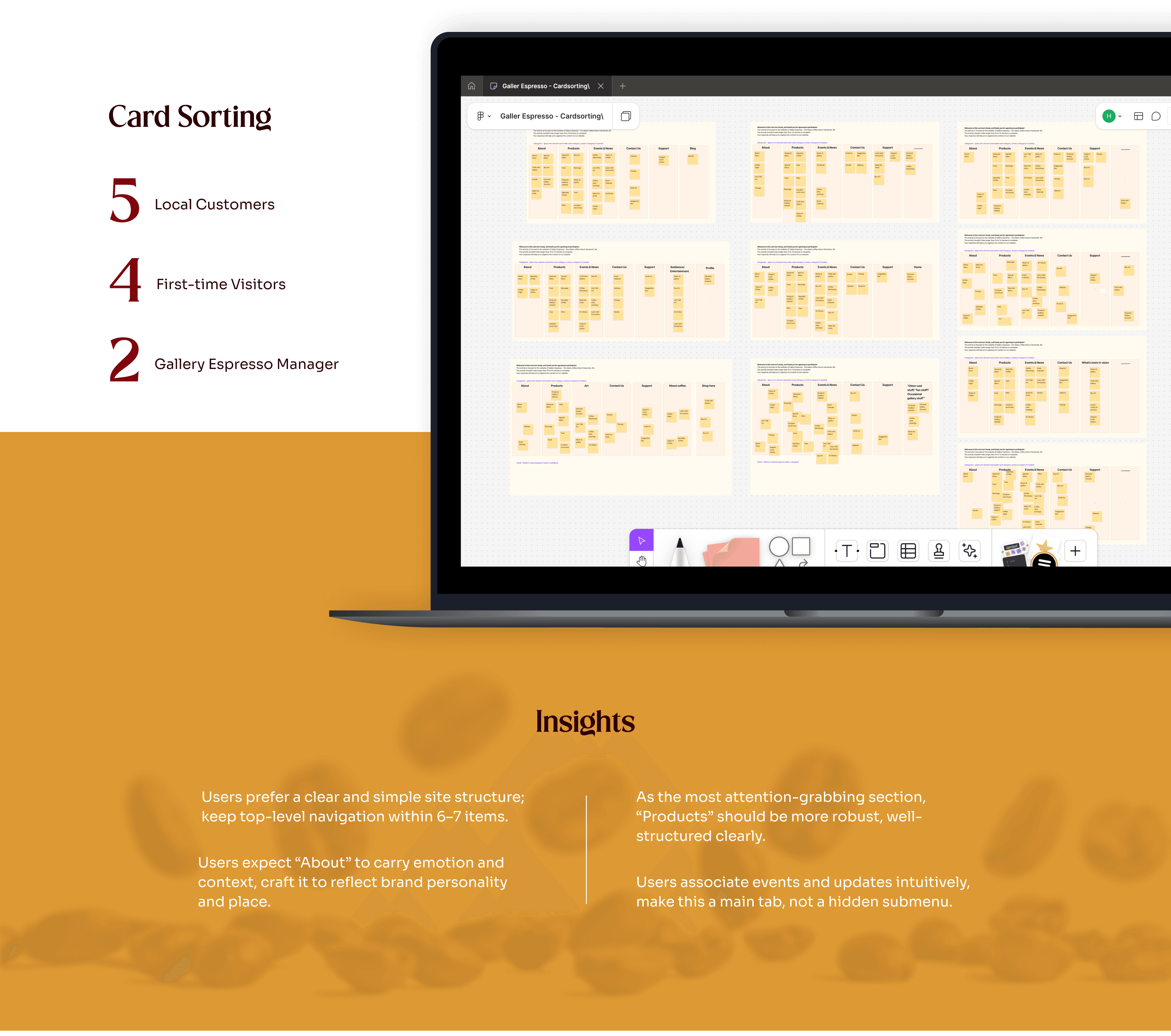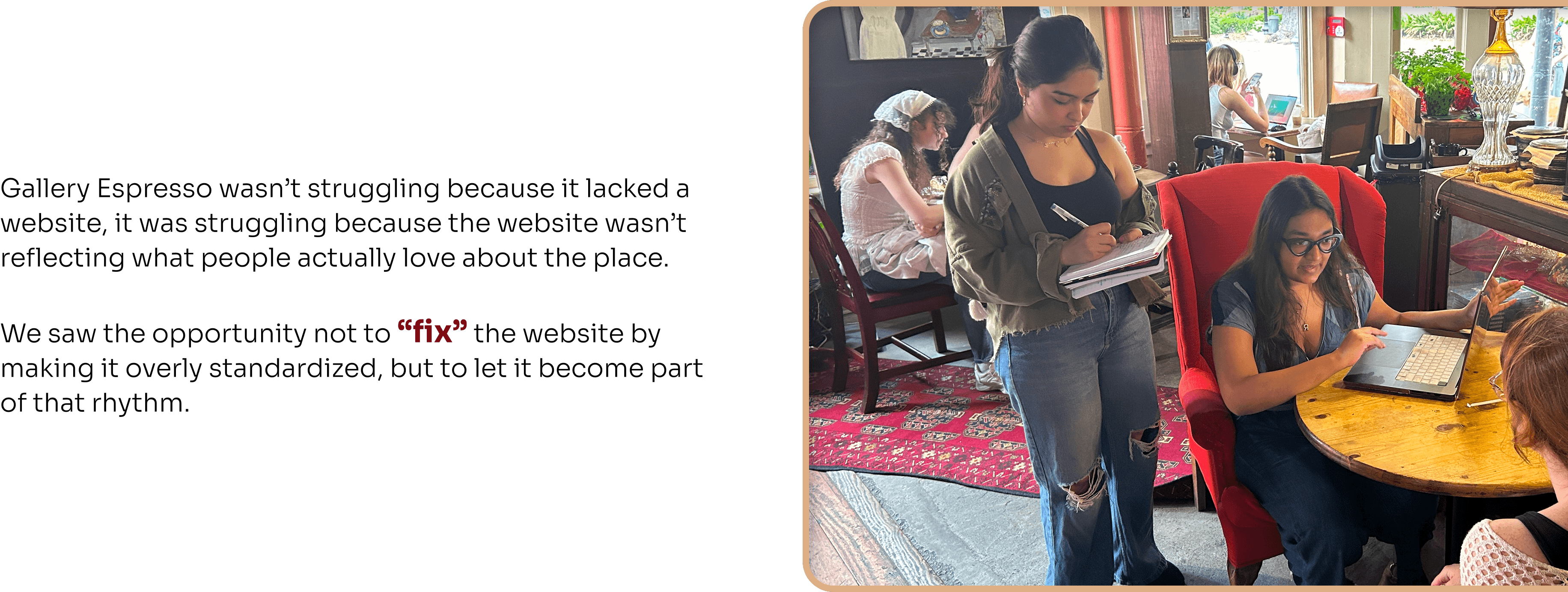 By closely observing customer behaviors, staff routines, and spatial interactions, I gained a deeper understanding of Gallery Espresso’s brand essence, one rooted in warmth, artistry, and community. Extending this approach to local competitors helped contextualize what made the café uniquely compelling, and where it risked falling behind.