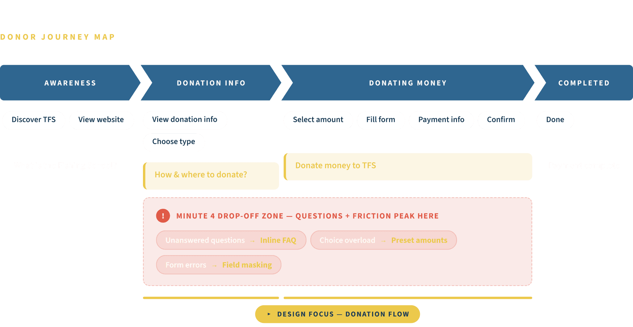The core insight: TFS didn't need a new website. It needed a redesigned path — from "I noticed TFS" to "I just donated" — that respected both the donor's time and the organization's constraints.